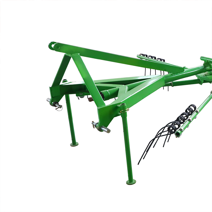 Roterende hø-rive bruger traktorens kraftudtagsaksel som en kraftkilde, der overfører kraft til gearkassen via en drivaksel. Efter hastighedsreduktion driver kraften den roterende arms centrale aksel til at rotere. Under kontrol af den knaststyrede mekanisme driver den roterende arm tandhjulets tænder for at afslutte rivningen og frigivelsen af hø. Operationen er videnskabelig og effektiv. Under driften samler de øsende tænder sig og spreder hø, når den roterende arm rører jorden, skubber den forsigtigt til den ene side for at danne høstrimler og vender derefter tilbage til udgangspositionen for at gentage cyklussen. Ved at justere vinklen på øsetænderne og arbejdshøjden kan høindsamlings- og spredetilstanden ændres fleksibelt for at tilpasse sig hø med forskellige tørhedsniveauer.